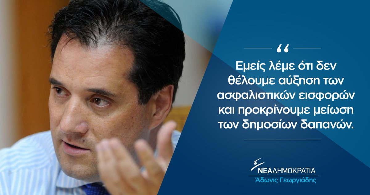 Ο κ. Τσίπρας από την άλλη, λέει ότι δεν θέλει μείωση των δημοσίων δαπανών, αλλά αύξηση των εισφορών. Nα αποφασίσουμε ποια πολιτική θέλουμε". Άδωνις Γεωργιάδης Αντιπρόεδρος ΝΔ http://on.fb.me/1UJP3gM