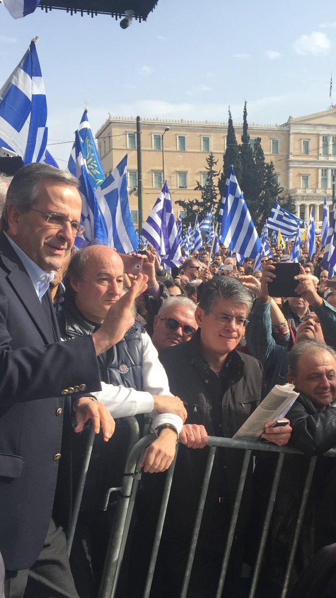 Οι συγκεντρώμενοι στη θέα του πρώην πρωθυπουργού άρχισαν να φωνάζουν «Ελλάς-Ελλάς, Αντώνης Σαμαράς».