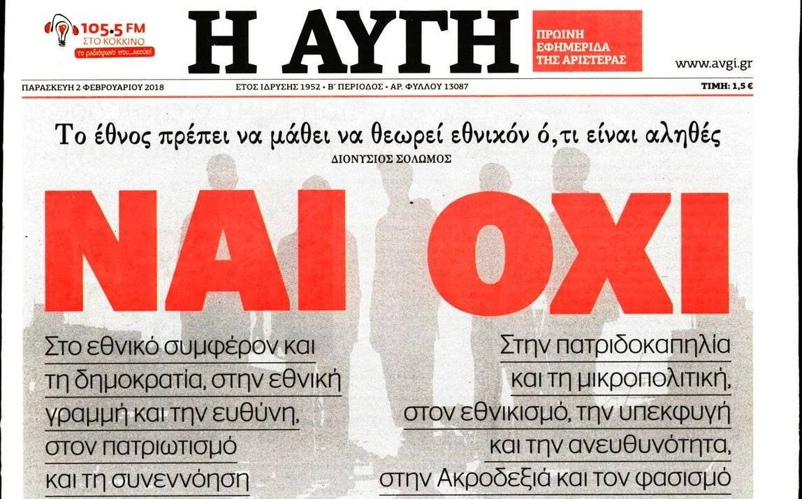 Αλλά η ιστορία τους εκδικείται. Σήμερα η Αυγή έβγαλε αυτό το ντροπιαστικό, διχαστικό πρωτοσέλιδο με το «ναι» και το «όχι». Η ίδια εφημερίδα η οποία πριν από 26 χρόνια, στις 16 Φεβρουαρίου 1992 είχε ένα άλλο πρωτοσέλιδο που έγραφε για την τότε συγκέντρωση για τη Μακεδονία με τίτλο «Με παλμό και ωριμότητα – Εντυπωσιακό το συλλαλητήριο στη Θεσσαλονίκη».