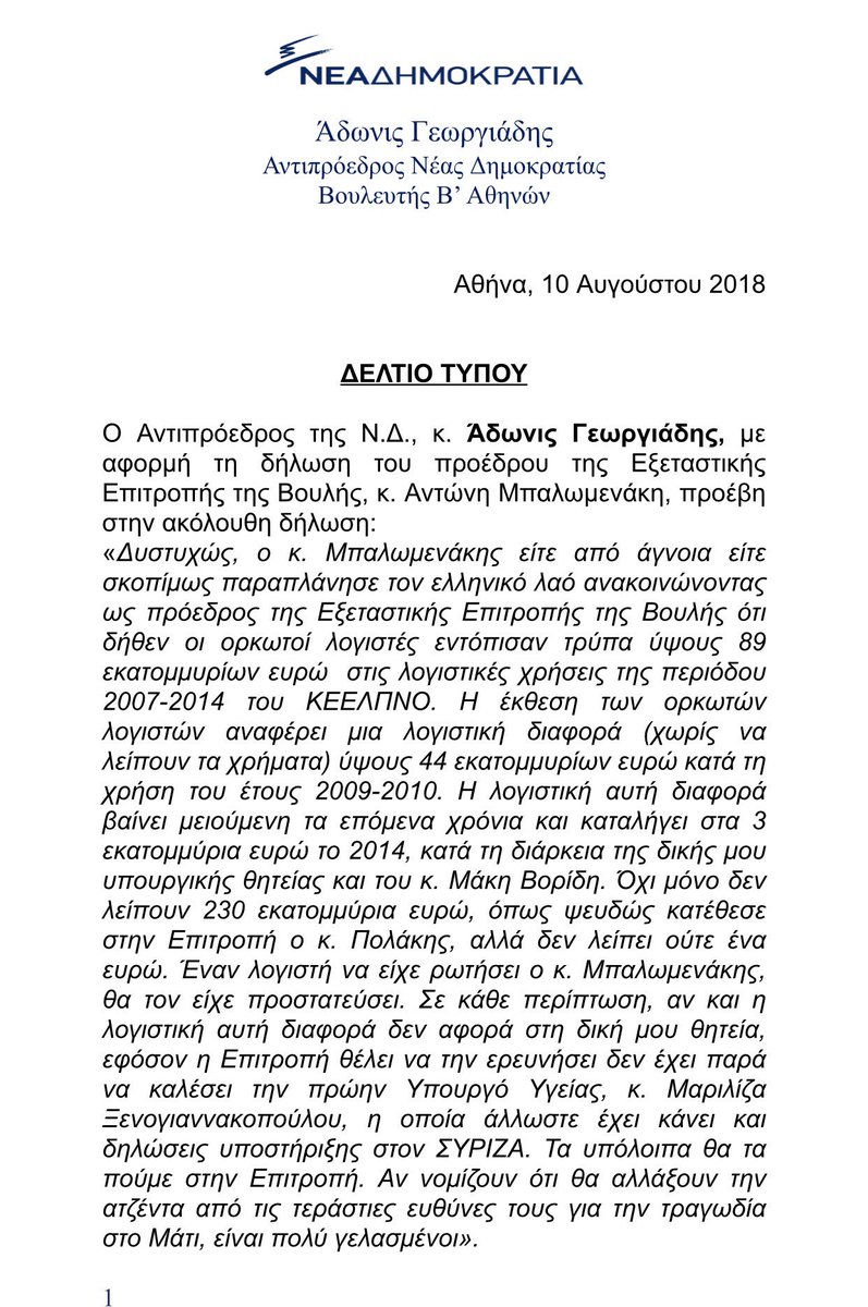Ο Α. Γεωργιάδης τονίζει πως ο κ. Μπαλωμενάκης είτε από άγνοια είτε σκοπίμως παραπλάνησε τον ελληνικό λαό ανακοινώνοντας ότι εντοπίστηκε «τρύπα» ύψους 89 εκατ. ευρώ στις λογιστικές χρήσεις της περιόδου 2007-2014 του ΚΕΕΛΠΝΟ.