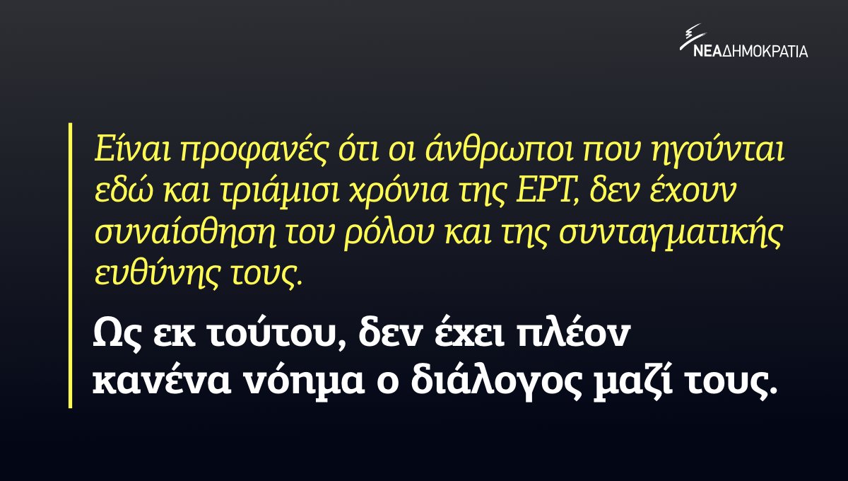 Μέχρι νεοτέρας, η μόνη σχέση που θα έχει η Ν.Δ. με την ΕΡΤ των ΣΥΡΙΖΑΝΕΛ είναι η εκ του νόμου υποχρεωτική μετάδοση των δραστηριοτήτων του προέδρου της αξιωματικής αντιπολίτευσης.