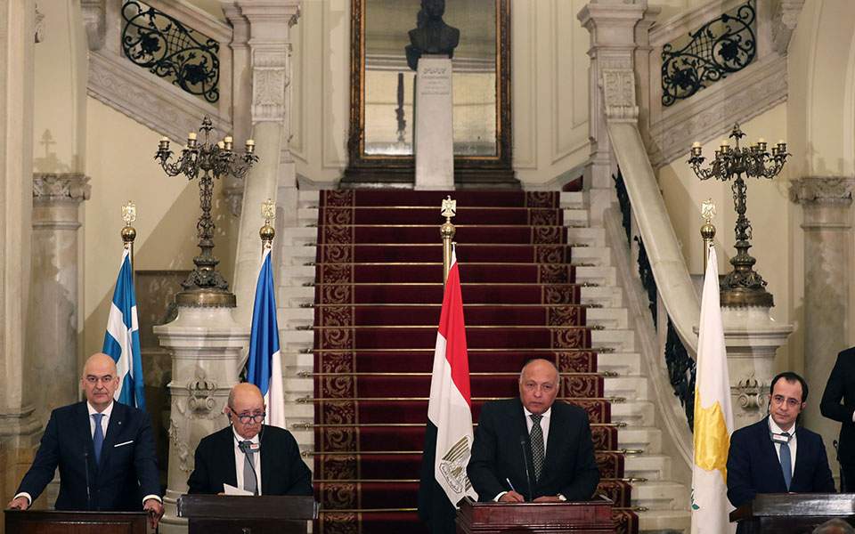Στην πενταμερή συνάντηση, που πραγματοποιήθηκε στο Κάιρο, συμμετείχαν οι υπουργοί Εξωτερικών της Ελλάδας Νίκος Δένδιας, της Κύπρου Νίκος Χριστοδουλίδης, της Αιγύπτου Σάμεχ Σούκρι, της Γαλλίας Ζαν-Υβ Λε Ντριαν και της Ιταλίας Λουίτζι Ντι Μάιο).