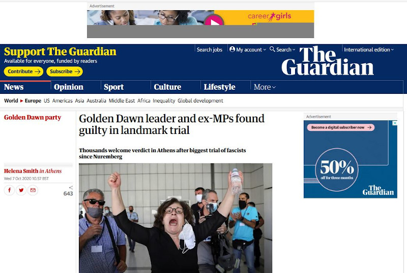 «Ο ηγέτης της Χρυσής Αυγής και πρώην βουλευτές κρίθηκαν ένοχοι σε δίκη-σταθμό», μεταδίδει η ανταποκρίτρια του Guardian στην Αθήνα, Έλενα Σμιθ, κάνοντας λόγο για «τη μεγαλύτερη δίκη φασιστών μετά τη δίκη της Νυρεμβέργης, αμέσως μετά τον Β' Παγκόσμιο Πόλεμο».
