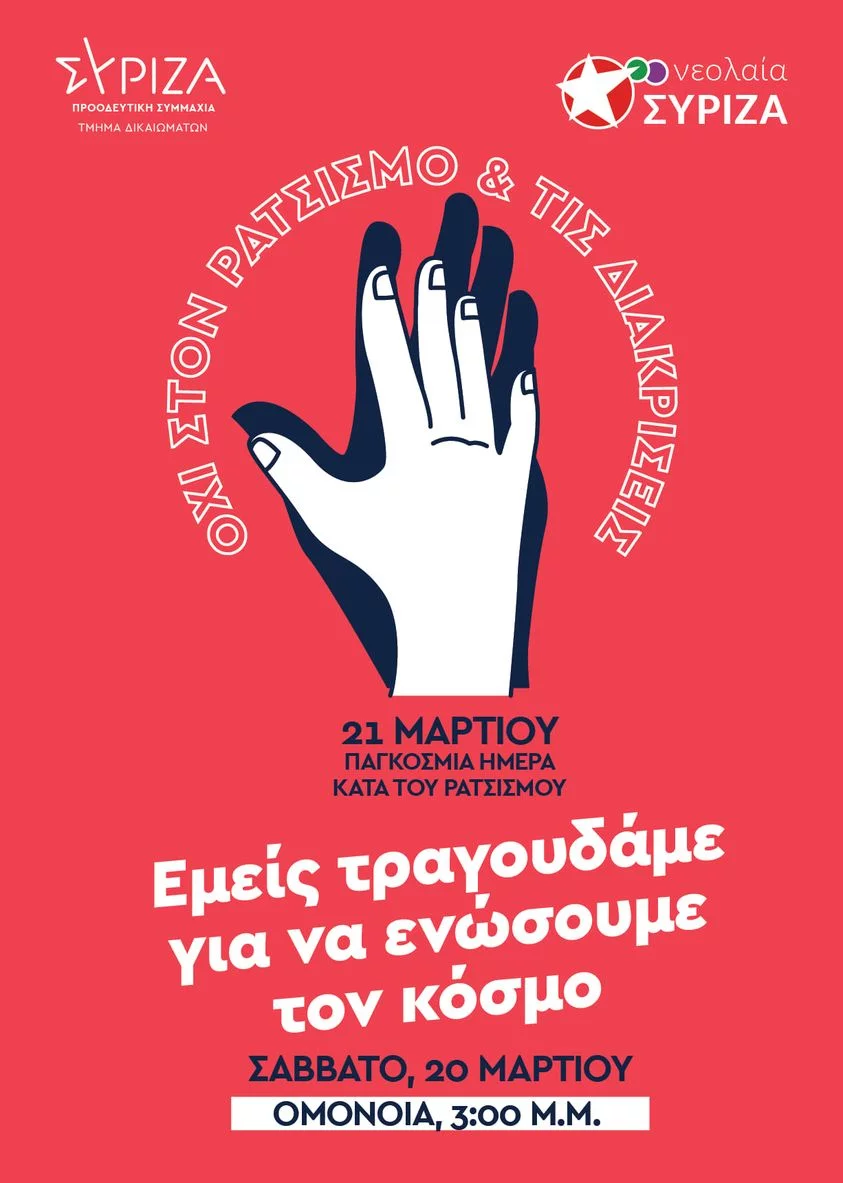 Πράγματι, ο ΣΥΡΙΖΑ καλεί σε διαδήλωση για την Παγκόσμια Ημέρα κατά του Ρατσισμού, το Σάββατο, 20 Μαρτίου: