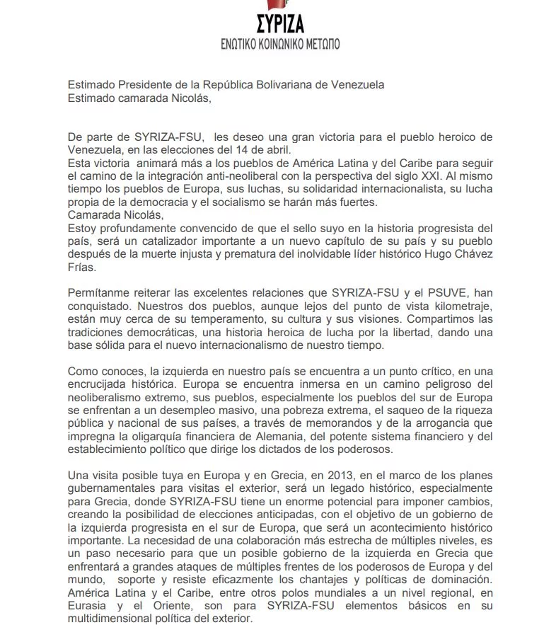 Έχοντας συζητήσει διεξοδικά με τον σύντροφο Τεμίρ Πόρας, όταν μας επισκέφθηκε στην Αθήνα, για το πώς θα ενισχύσουμε την αλληλεγγύη μεταξύ μας, και έχοντας την πλήρη στήριξη του πρεσβευτή σας στο Βερολίνο Ροδρίγο Τσάβες Σαμούδιο, περιμένουμε τη δική σου σημαντική στήριξη, που θα εκφραζόταν με τρόπο έμπρακτο, έτσι ώστε η προετοιμασία μας για τον σχηματισμό μιας αριστερής κυβέρνησης να έχει προοπτικές επιτυχίας. Αυτή η προοπτική θα είχε πολλαπλές επιπτώσεις στην υπόλοιπη Ευρώπη και κυρίως στις χώρες του νότου, καθώς θα ανέτρεπε το στάτους κβο της νεοφιλελεύθερης καπιταλιστικής παγκοσμιοποίησης.