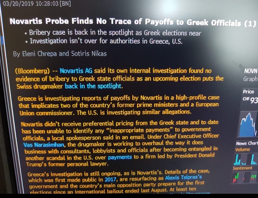 Για να έρθει τώρα η έρευνα της ίδιας της πολυεθνικής. Όπως αναφέρεται στο Bloomberg, επικαλούμενο την εσωτερική έρευνα της Novartis, δεν υπάρχει κανένα στοιχείο χρηματισμού Ελλήνων αξιωματούχων και ενώ το ζήτημα, όπως αναφέρει το ειδησεογραφικό πρακτορείο, έρχεται στην επικαιρότητα, εν όψει και των εκλογών.
